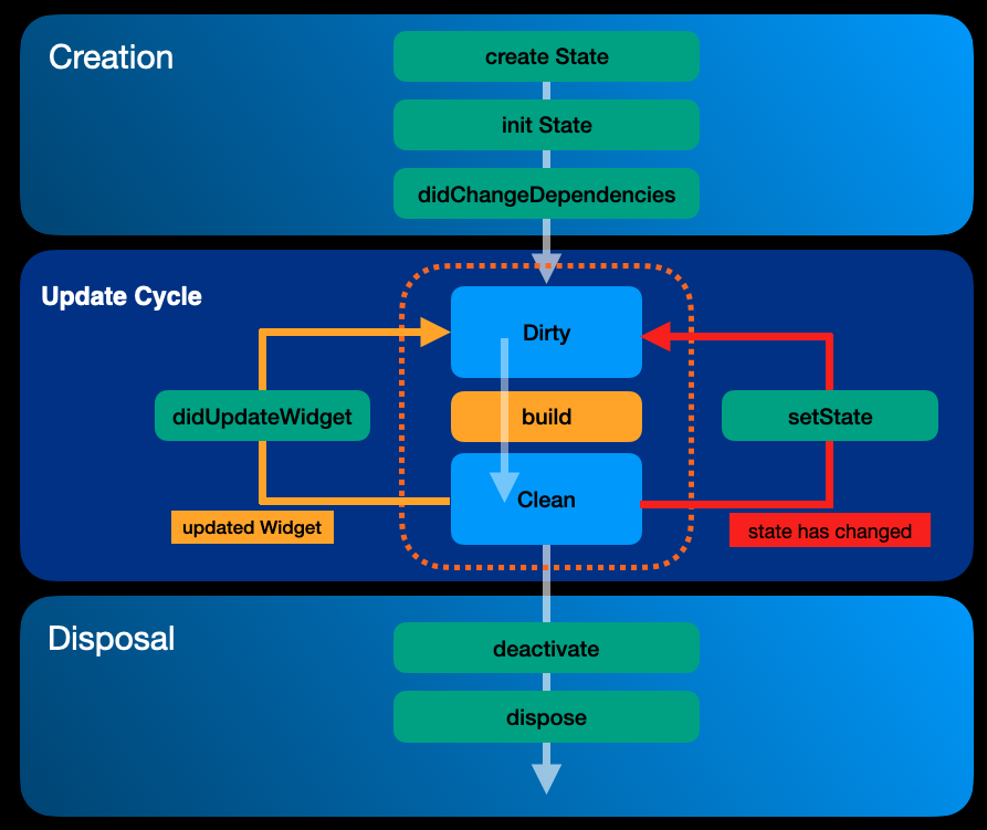 아래는 Flutter에서 StatefulWidget이 생성 → 갱신 → 제거까지
